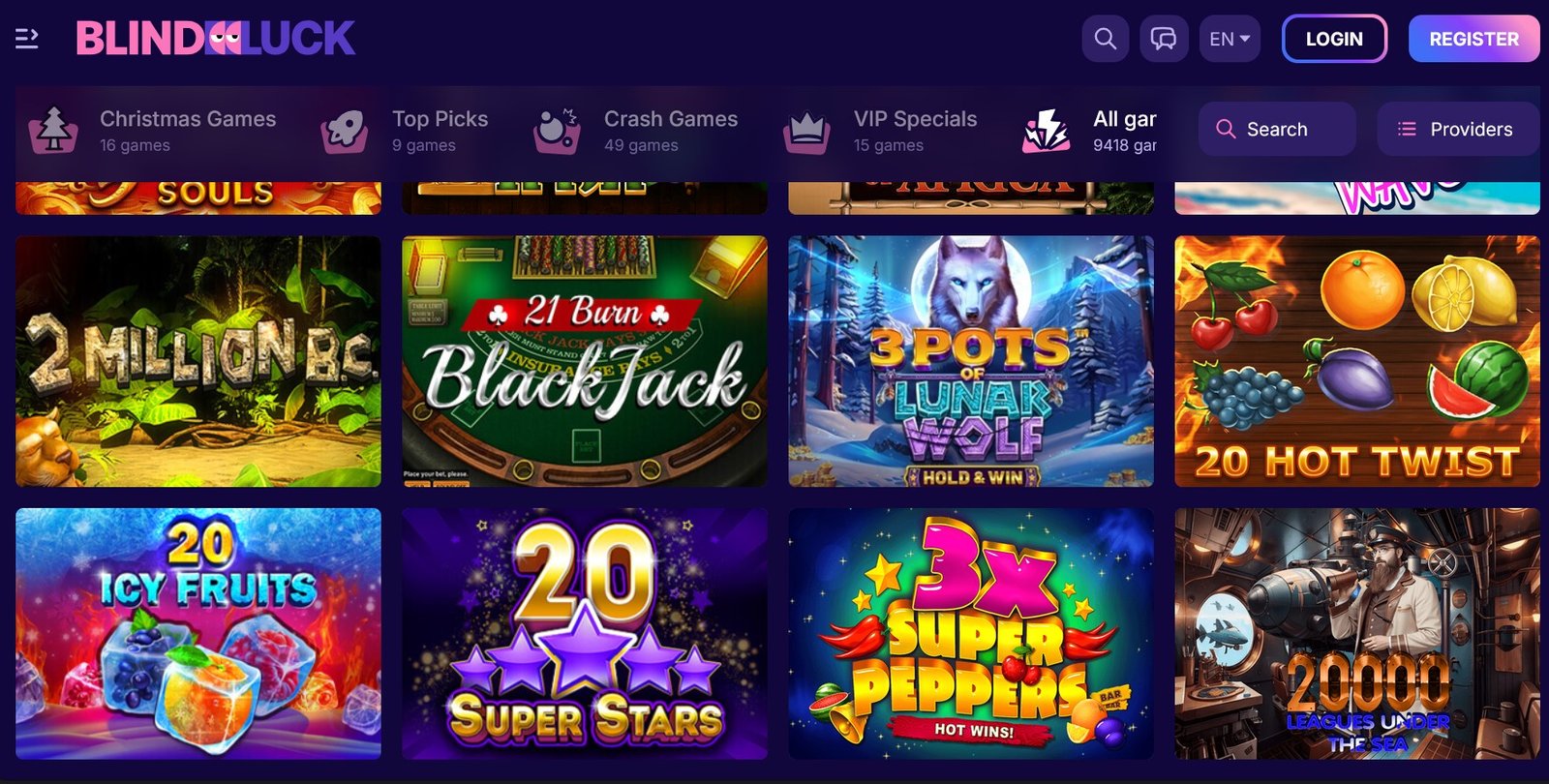 Blind Luck cuenta con más de 2.500 slots de los principales proveedores y un casino en vivo con croupiers profesionales y game shows interactivos en HD. La plataforma destaca por su alta volatilidad, ideal para jugadores que buscan emociones fuertes y grandes ganancias.