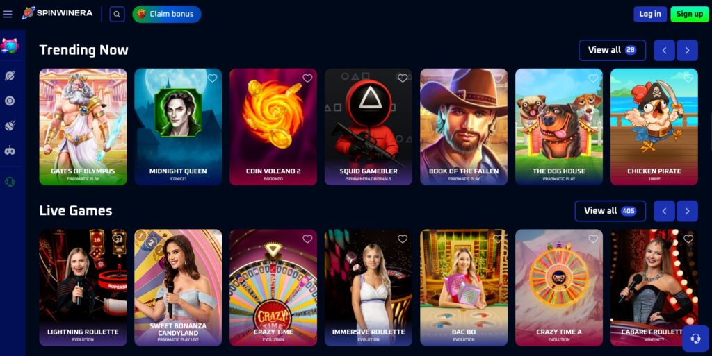 Spinwinera ofrece más de 5.000 juegos, cubriendo todas las categorías principales de un casino online moderno. Las tragamonedas forman el núcleo de la oferta, con títulos de estudios reconocidos como Evolution Gaming, Pragmatic Play, NetEnt o Microgaming.