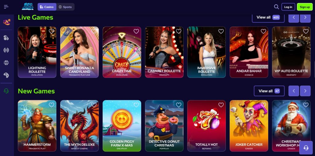 • Large sélection de jeux : slots, jeux de table et live casino.