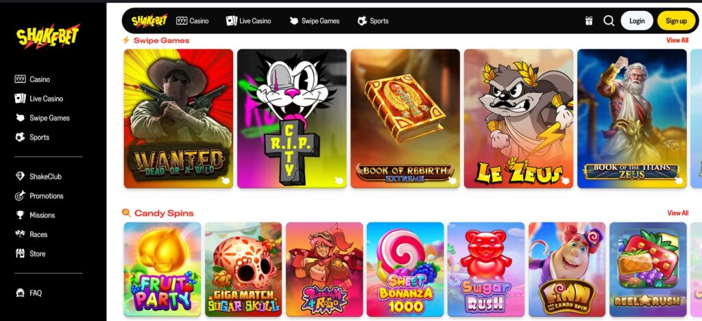 Avec plus de 4 000 jeux, ShakeBet propose l’un des catalogues les plus complets du marché en 2025. Les jeux proviennent de studios majeurs comme Pragmatic Play, NetEnt et Evolution Gaming, garantissant qualité graphique, équité et innovations constantes.